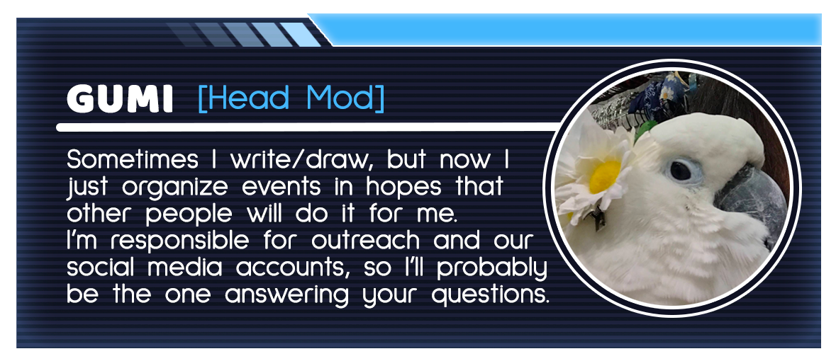 21+ adultMulti-fandom artist/writer, casually competitive gamer, and bird enthusiast.For all inquiries, twitter DM would be the best way to contact me.